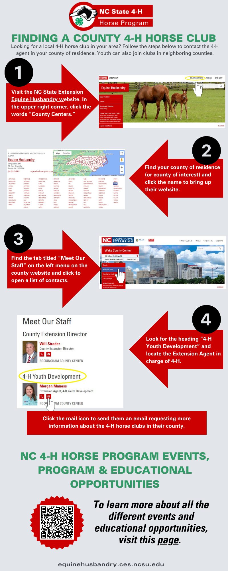 Collapse ▲Looking for a local 4-H horse club in your area? Follow the steps on the infographic below to contact the 4-H agent in your county of residence. Youth can also join clubs in neighboring counties.