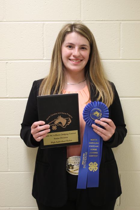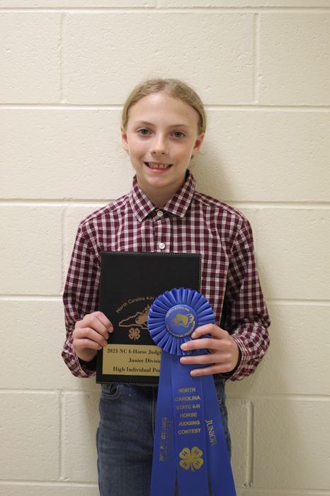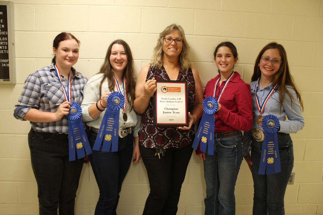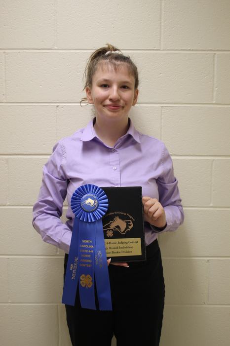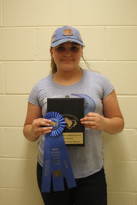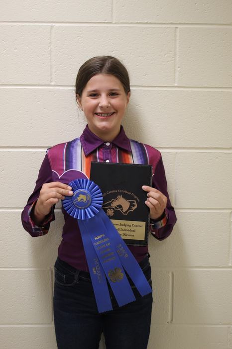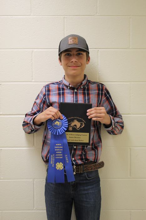 In the Junior division, Luke Jones from Jones County won the High Scoring Halter Individual. Cabarrus County's Avery Pigg placed first in Performance. Kylee Green from Union County was the High Individual in Oral Reasons. The Overall High Scoring Individual award went to Anna Yemtchuk from Cabarrus County. The champion Junior Judging team was the Cabarrus Harper 1 team coached by Laura Harper. Team members were Emery Atkinson, Anna Yemtchuk, Skyler Hicks, Madison Bishop.